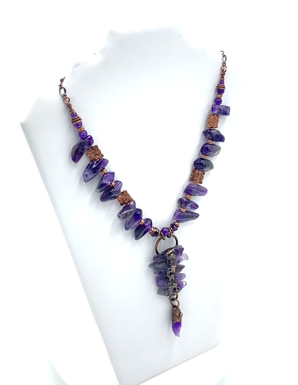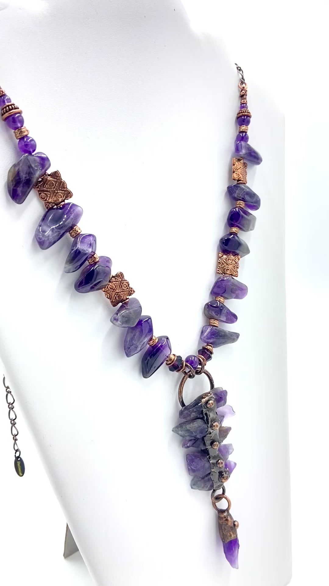 Indulge in the exquisite boldness of this one-of-a-kind statement necklace! Made with handpicked Amethyst stones and Copper chain, this mystical masterpiece is perfect addition to an your collection. Whether you wear it or display it as a symbol of your unique spirit, this unique piece is sure to captivate. Handcrafted with real natural materials.