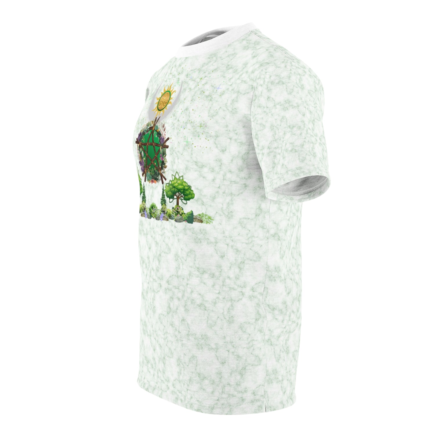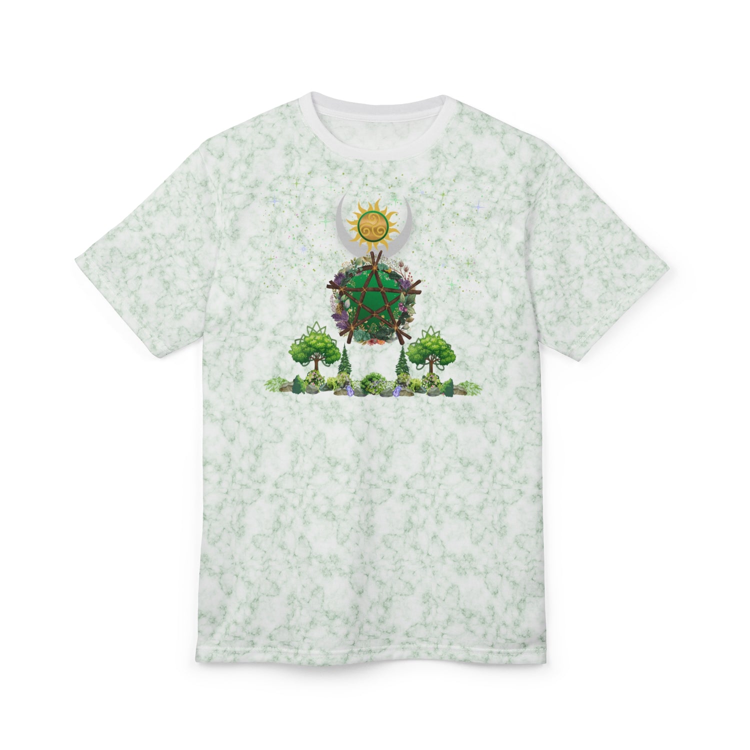 Breathe green energy into every day with this lightweight, all-over print tee. Soft marbled mint tones form a gentle backdrop for a hand-drawn, nature-inspired motif. The design is like a tiny wearable altar—quiet, intentional, hopeful. Wear it on slow mornings, while tending a balcony garden, or at small outdoor gatherings. The fit sits comfortably at the shoulders and chest without feeling bulky, so the artwork stays front-and-center. This tee speaks to people who care for the planet in thoughtful ways and who want their wardrobe to reflect gentle activism and everyday reverence for the natural world.