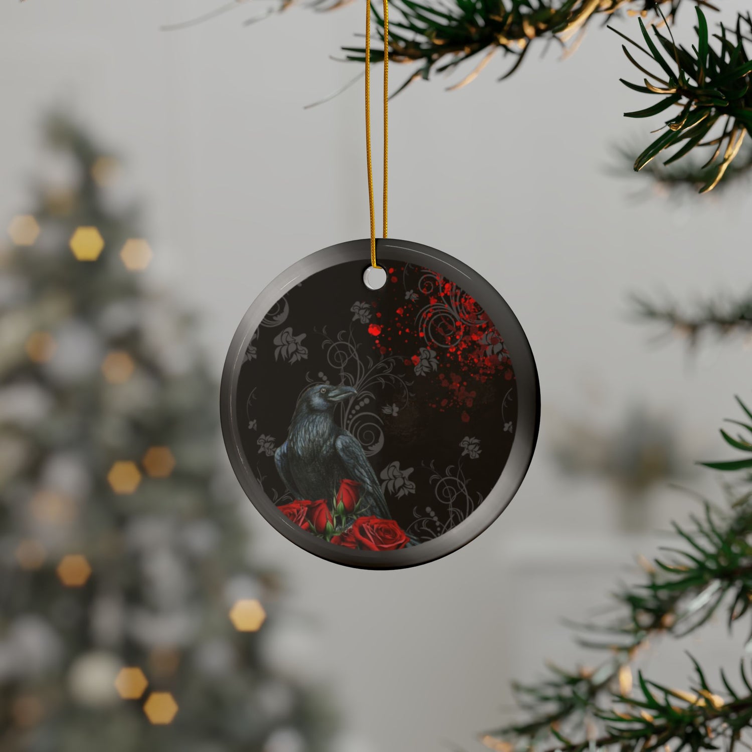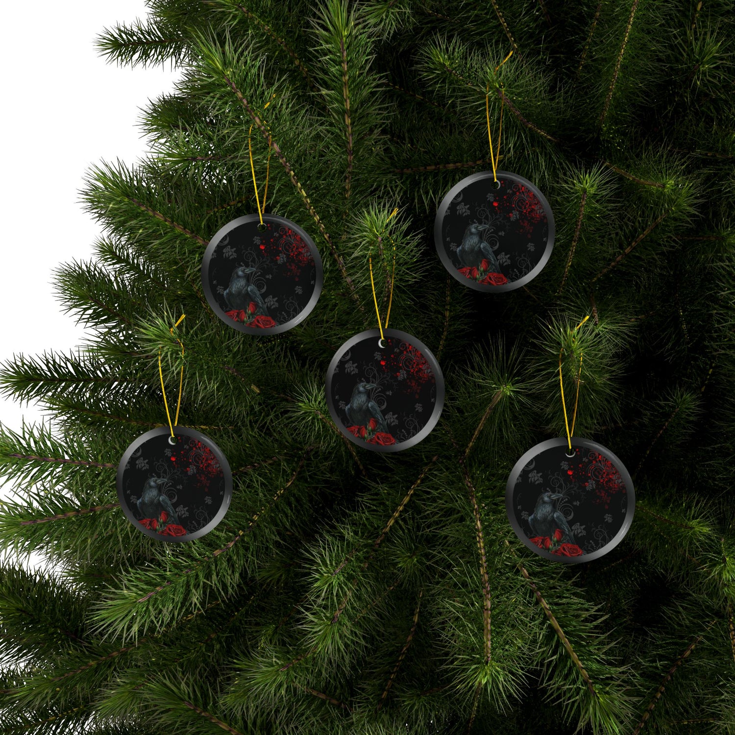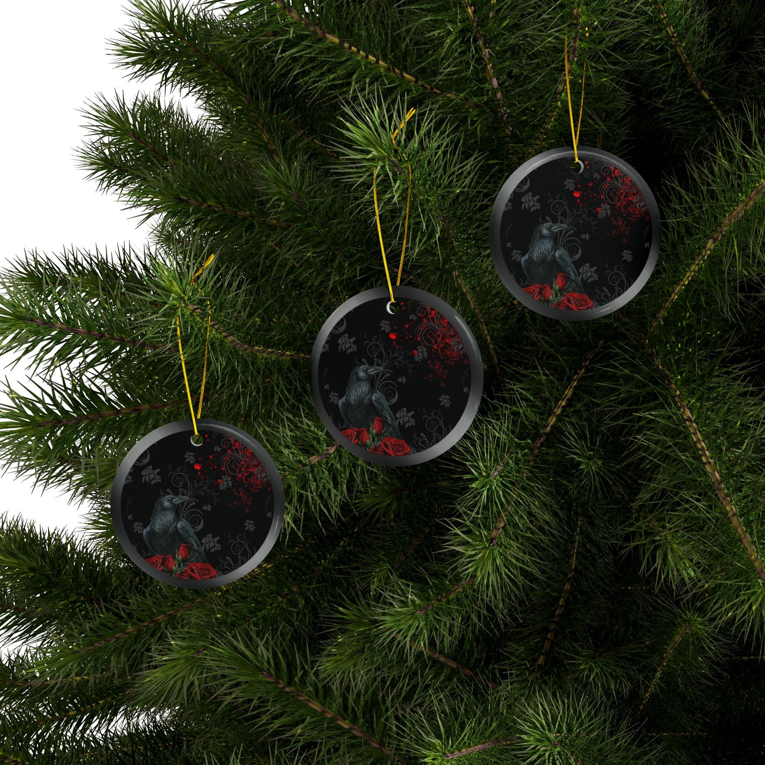 Black Feather / Red Ceramic Ornaments, perfect for a goth aesthetic. Ideal for Halloween through Gothmas tree decor, providing an elegant and chilling vibe. Relevant for those who love dark and sophisticated holiday decorations.