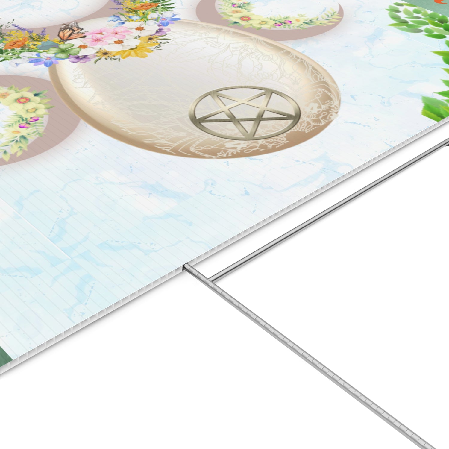 A bright, nature‑centered lawn sign that brings springtime energy to your yard. Soft watercolor backgrounds and fresh green foliage frame a stylized pagan motif‑hare crowned with a crescent Tri Blessing Moon — a symbol the renewal of life, of ones pledge, and of magick. The one‑sided print pops with vivid color on durable fluted polypropylene, and the included metal H‑stake makes it easy to set in flowerbeds, near walkways, or by the porch. It reads like a quiet celebration of seasonal change — a subtle, artful way to mark the turning of the year and welcome growth into your outdoor space.