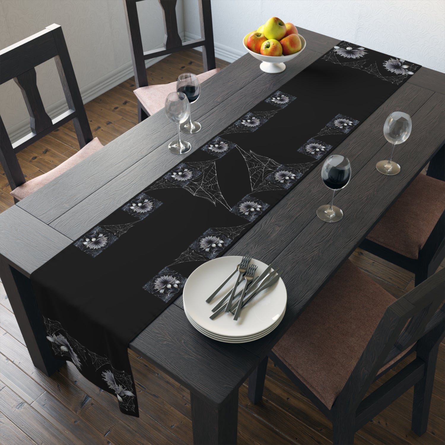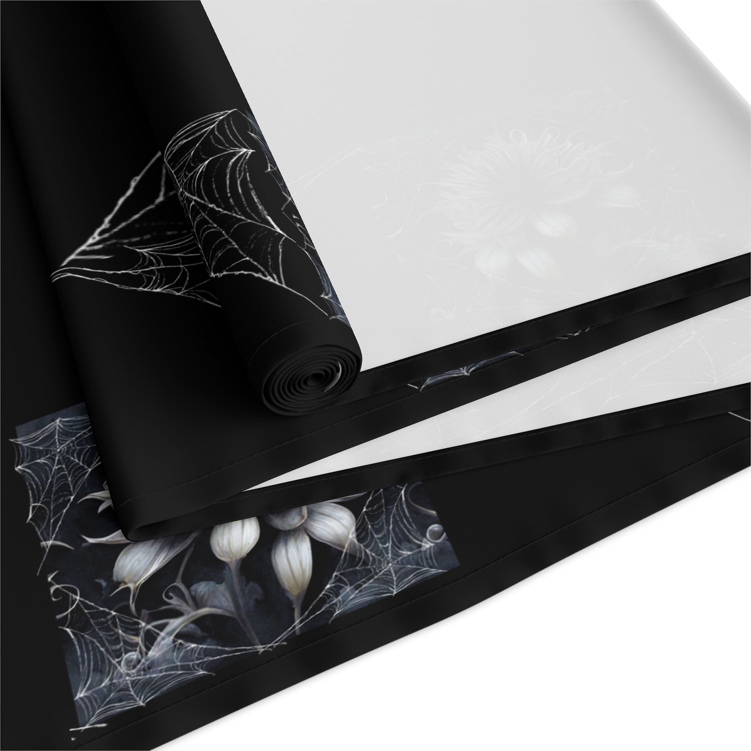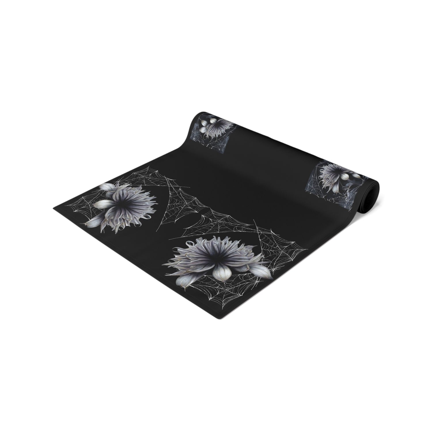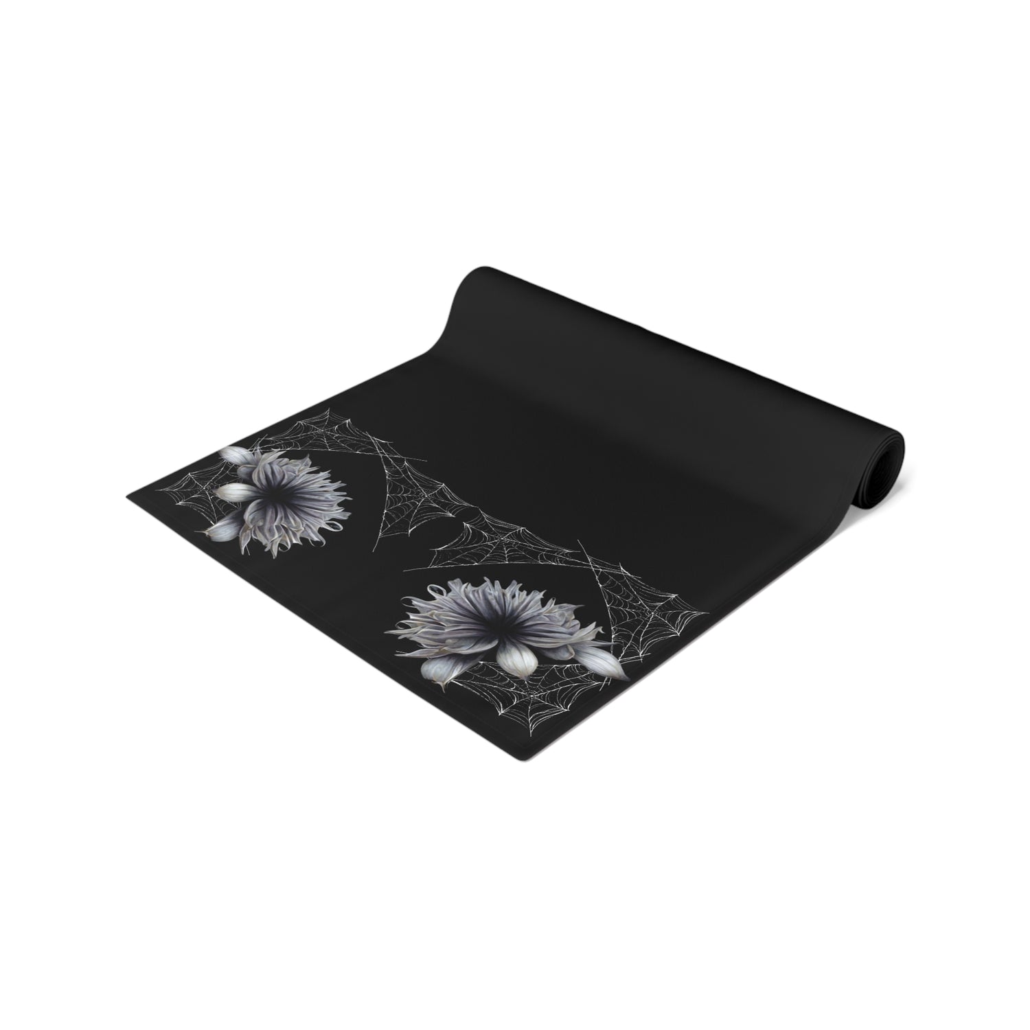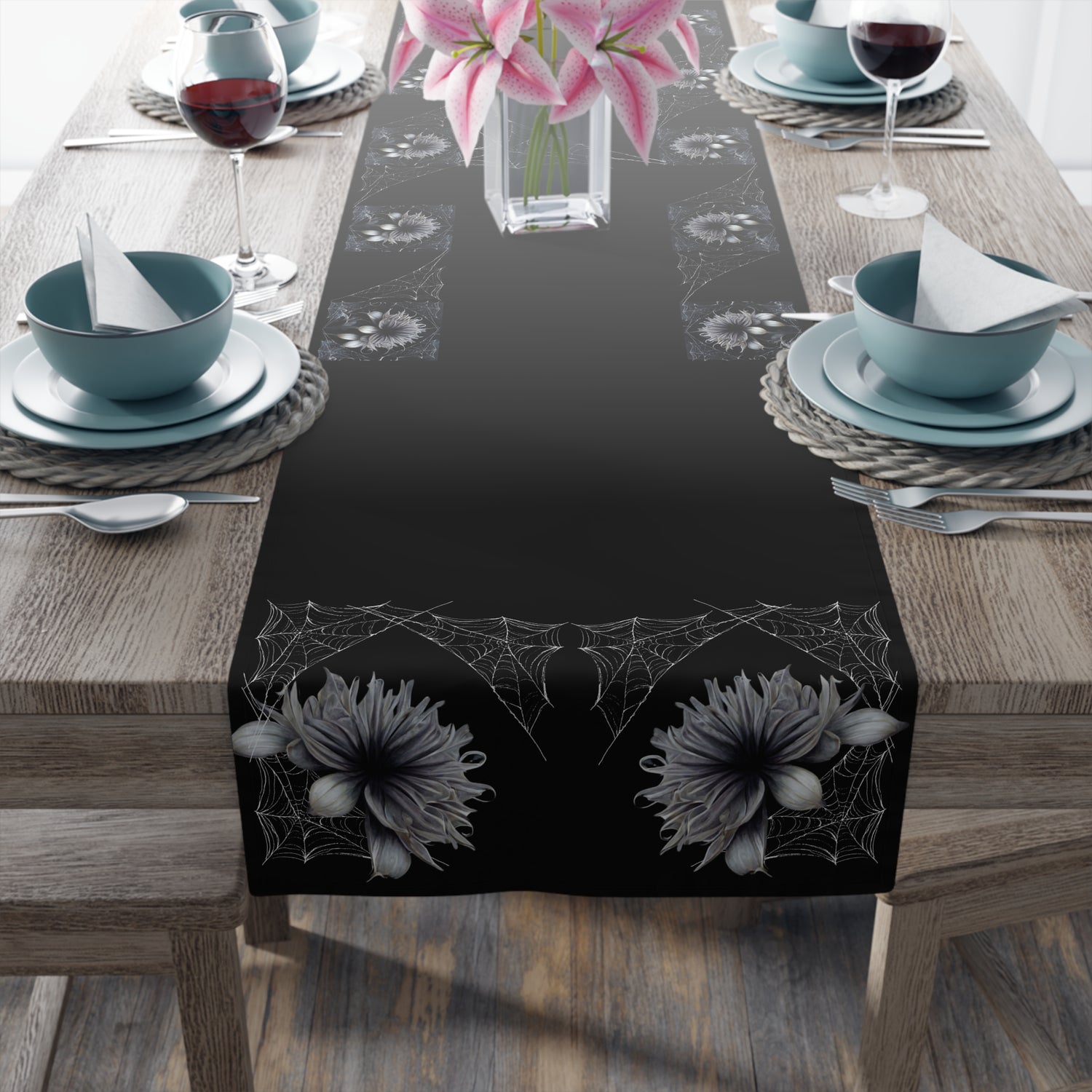 This Floral Web Table Runner is perfect for those who love a Dark and Gothic aesthetic. With cob webs designs and elegant flowers, it is ideal for creating a mysterious and elegant look, not just for the holidays but for many occasions. Makes a great gift and excellent for those who celebrate Gothmas or love nightmare holiday decor.