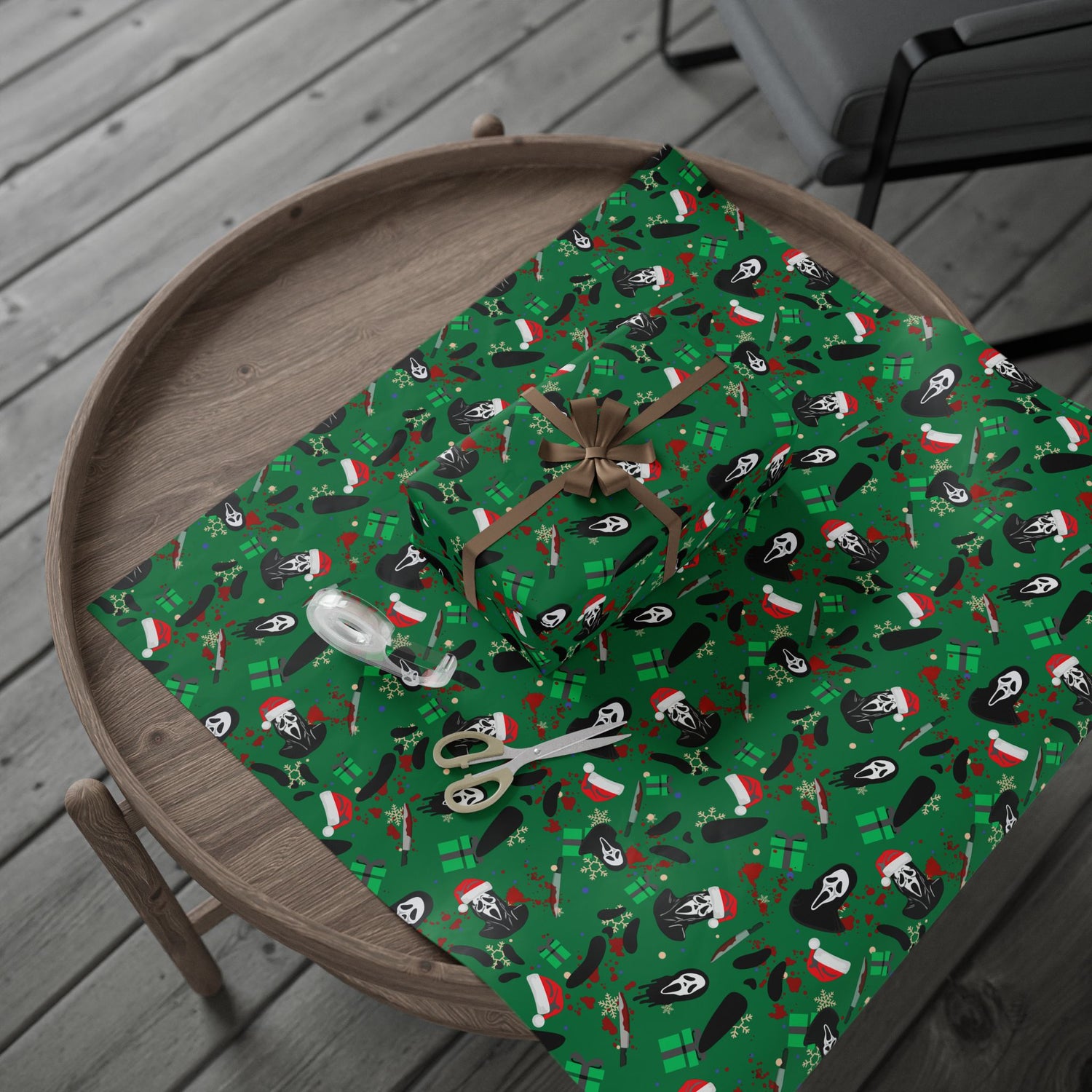 Make your Holidays a Scream with this Ghost Face themed gift wrap papers perfect for adding a spooky and nightmare touch to your Christmas presents. Ideal for those who enjoy a darker holiday aesthetic and want to stand out with unique gift wrapping. Relevant for Halloween, Christmas, and other spooky celebrations.