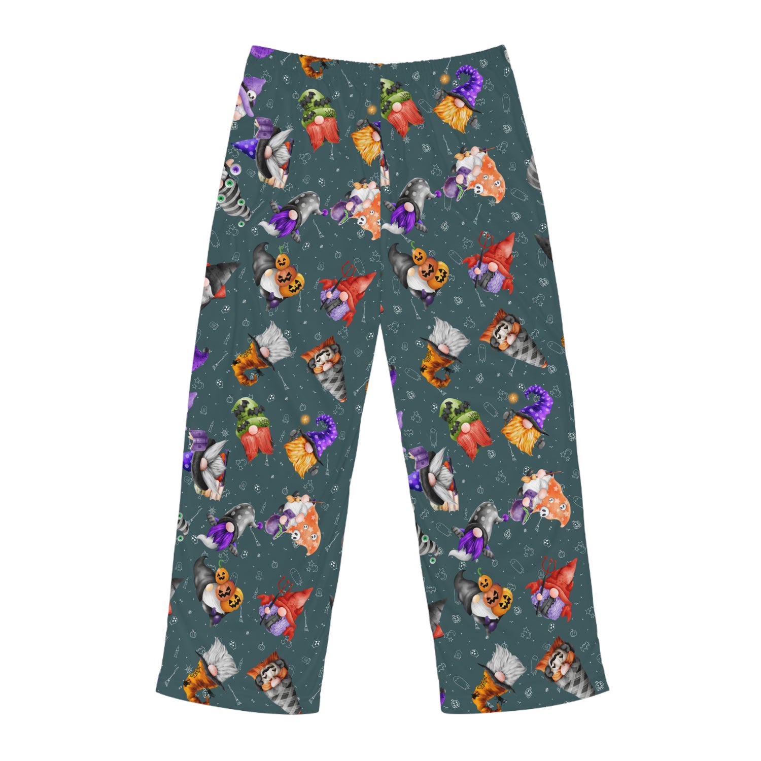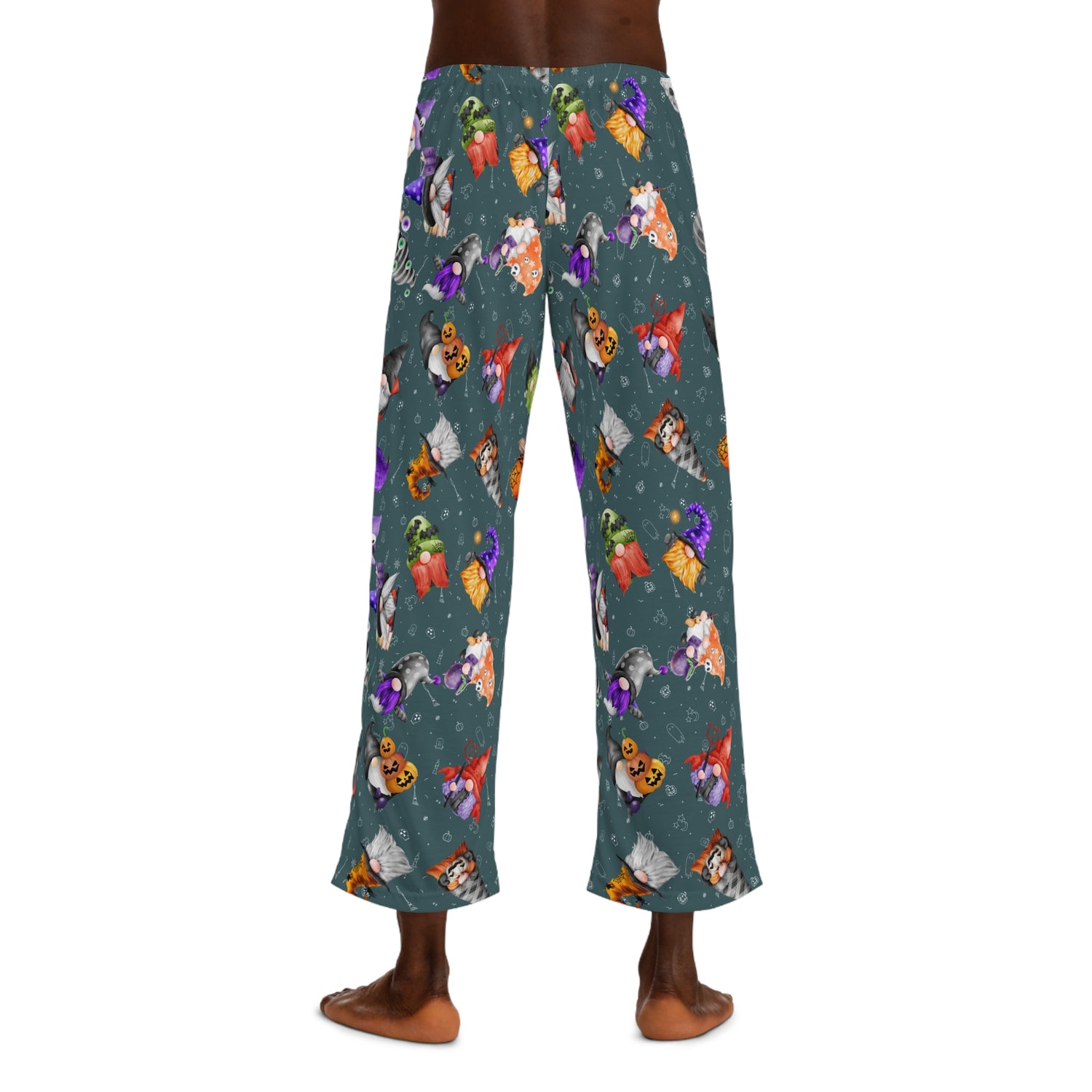 Gnome-o-ween Men's Pajama Pants, cozy sleepwear perfect for Fall celebrations to Nightmare Holidays. Made from soft 100% polyester jersey with a bright and crisp print, featuring a fun Gnomey design with an easy use drawstring waist for a perfect fit. Ideal gift for him.