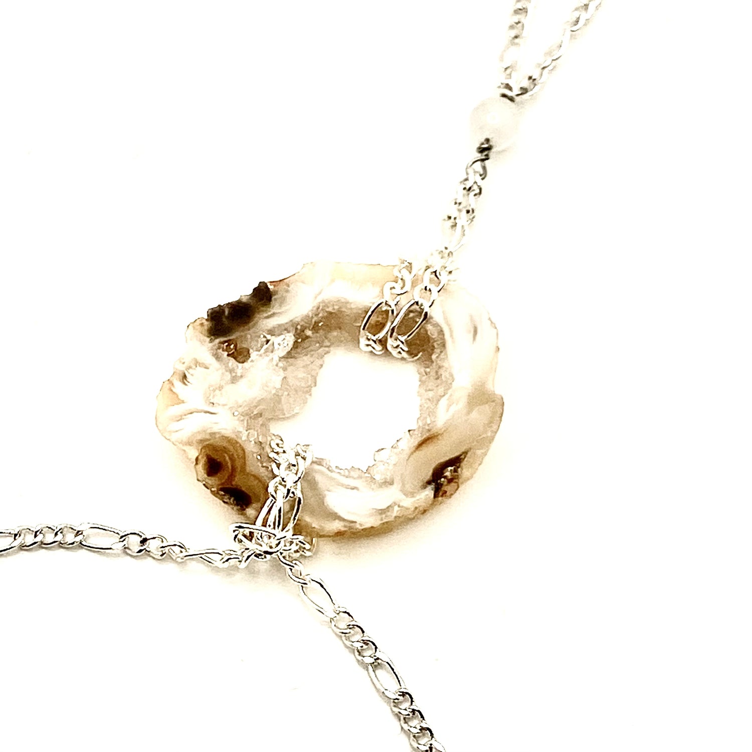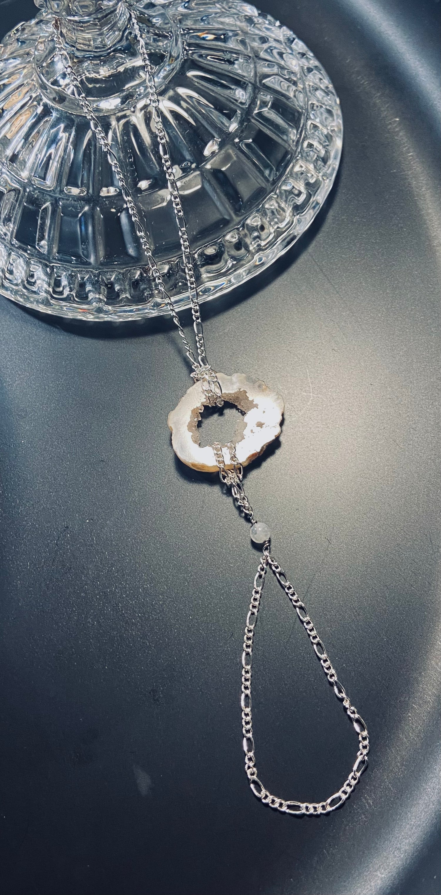 Materials: Geo Agate Faceted Circle, Stainless Steel Silver Chain, Quartz Crystal Bead, Lobster Claw Closure