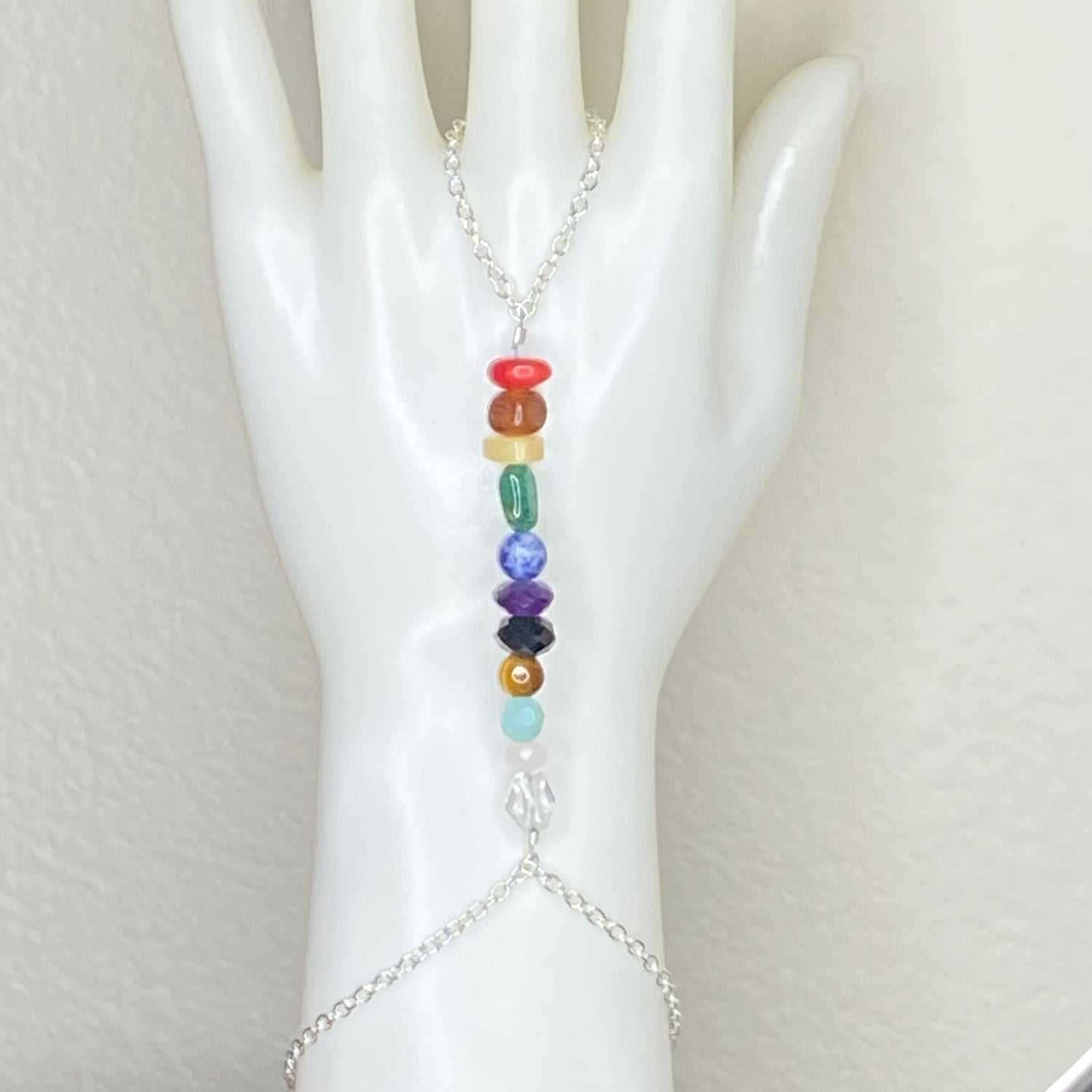 Pride in Gemstones - Hand Piece. Various Gemstones Representing the Colors of the Inclusion Pride Flag on Silver Chain Bracelet.