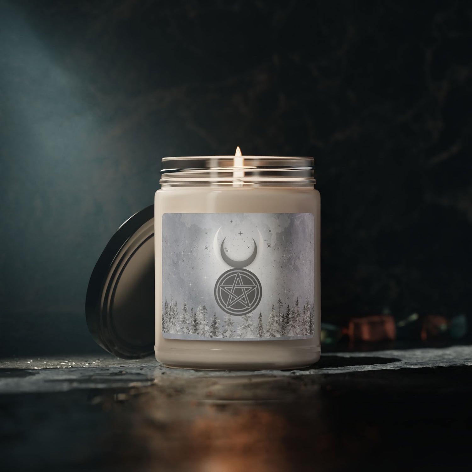Horned Moon | Solstice Scented Soy Candle with a witchy and winter solstice vibe. Perfect for those celebrating Yule and looking for a cozy, festive atmosphere. Relevant to those who enjoy unique scents and eco-friendly products.