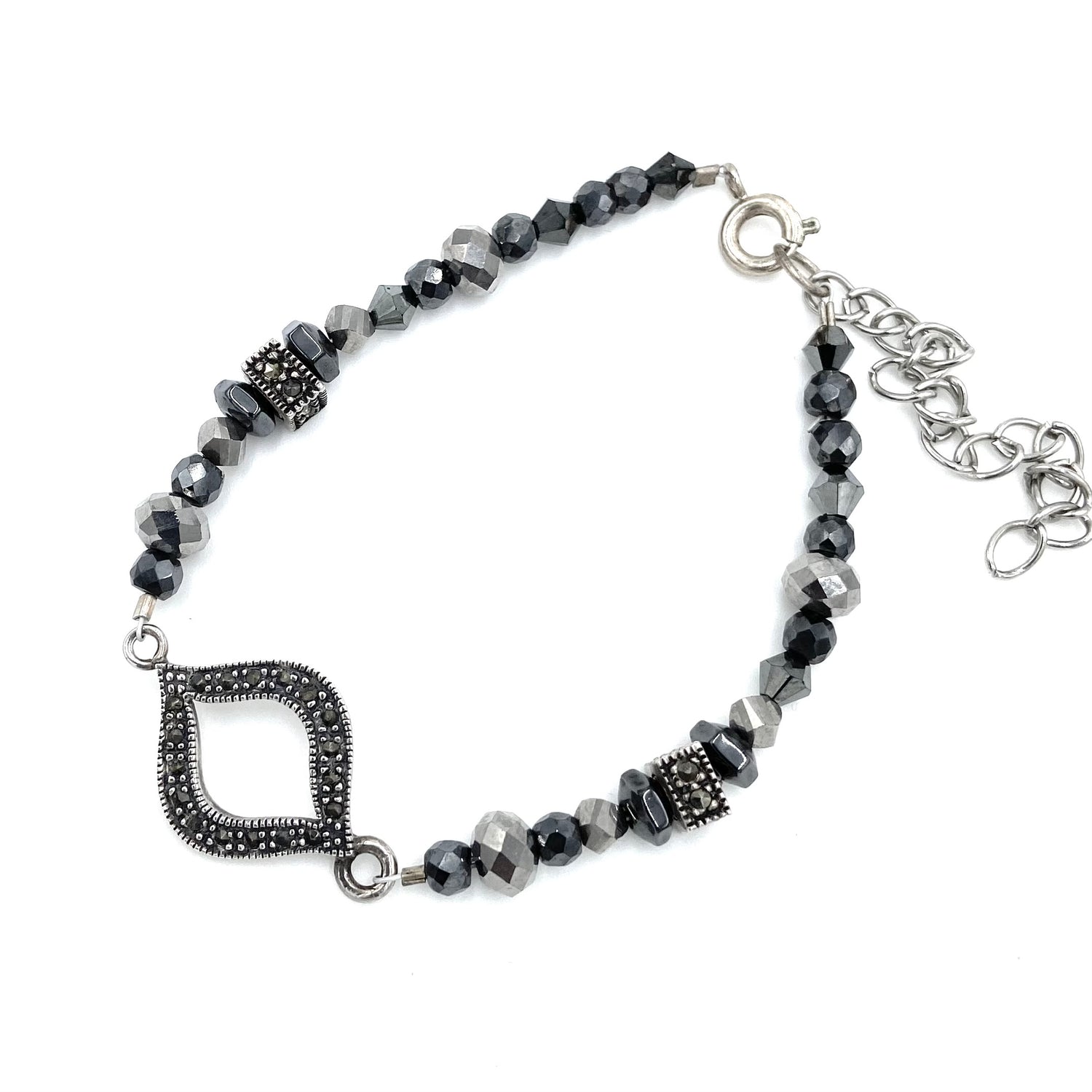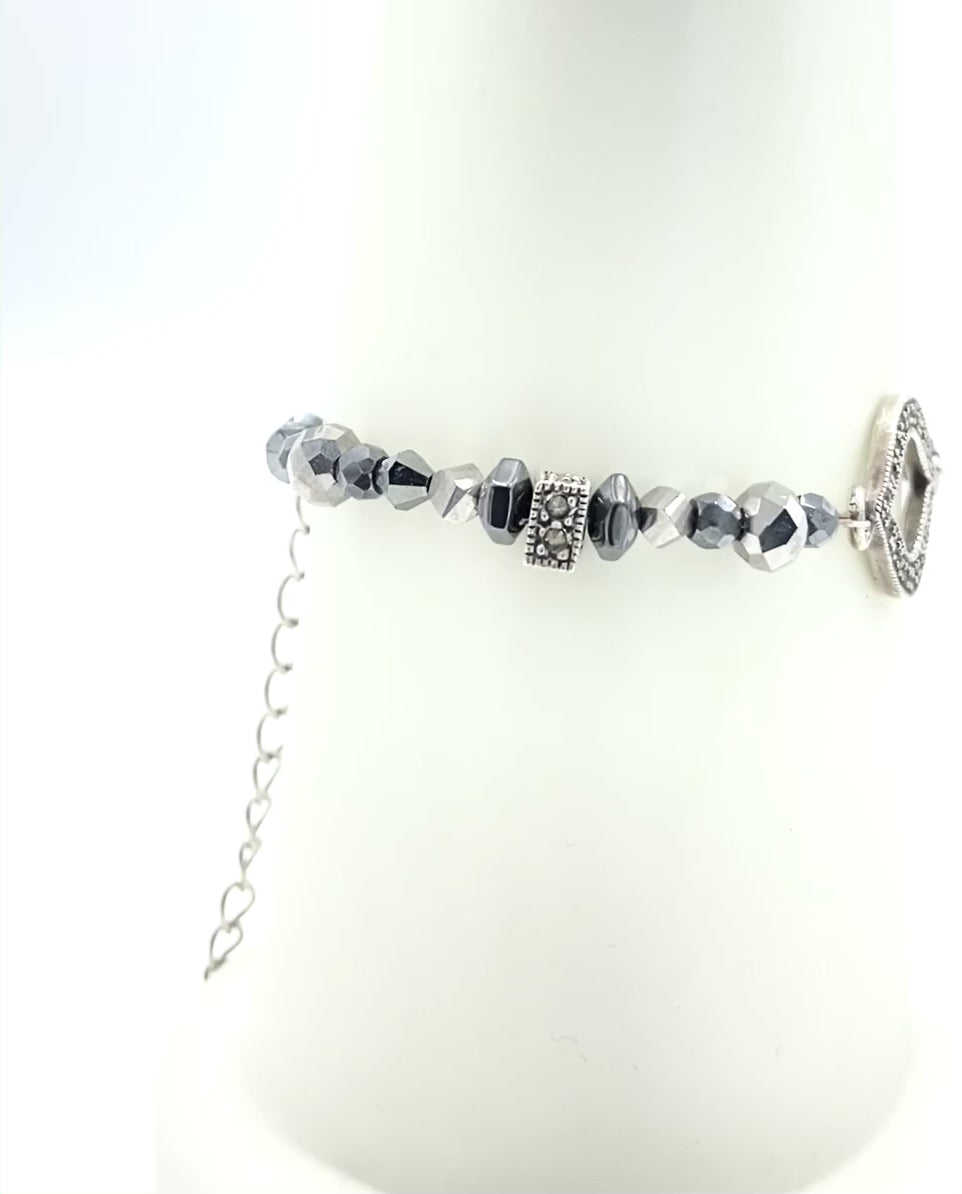 This timeless beauty of our exquisite Kiss of Marcasite Bracelet. Adorned with intricate Marcasite crystals, Hematite crystals and elegant grey Australian crystal beads, this handcrafted bracelet is a must-have addition to any collector's treasure trove. This piece was carefully crafted with stainless steel findings, ensuring both durability and a luxurious aesthetic. Embrace the unique allure of this stunning accessory with its perfect blend of Marcasite, semi-precious stones, hematite, and lustrous grey crystals.