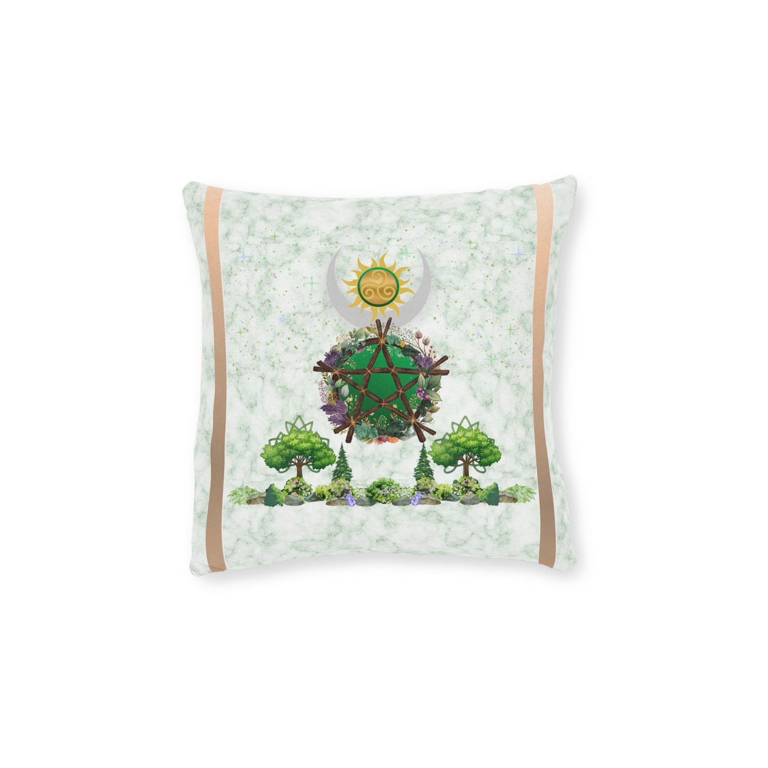 This square pillow brings a quiet, green energy into a cozy corner. Soft faux-suede and plush filling cradle your head while a double-sided print. A verdant goddess, crescent moons, and a rooted tree creates a small altar to your couch or reading chair. Subtle marbled backgrounds and pale trim keep the design gentle — it blends with peaceful bedrooms, plant-filled nooks, or meditation spaces. Hold it, lean back, and let the earthy symbolism and muted tones slow your breath.