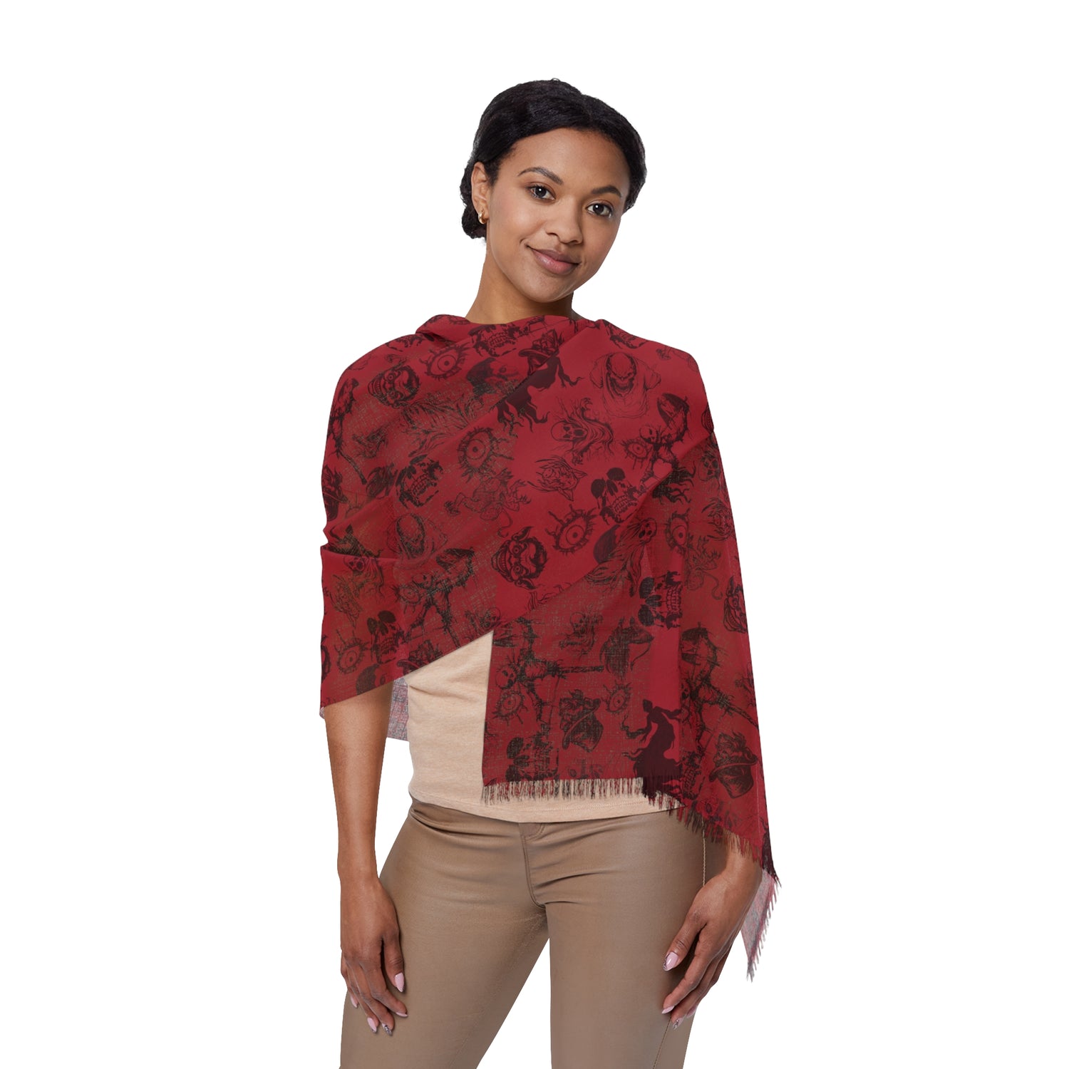 Monstrous Sight Scarf is a who's who of horror monsters gathered, with its eerie gothic vibe, made of soft and light material. This scarf is perfect for accessorizing and adding a touch of nightmare to any outfit. Ideal for people who love Halloween, horror fan fashion, and unique accessories.