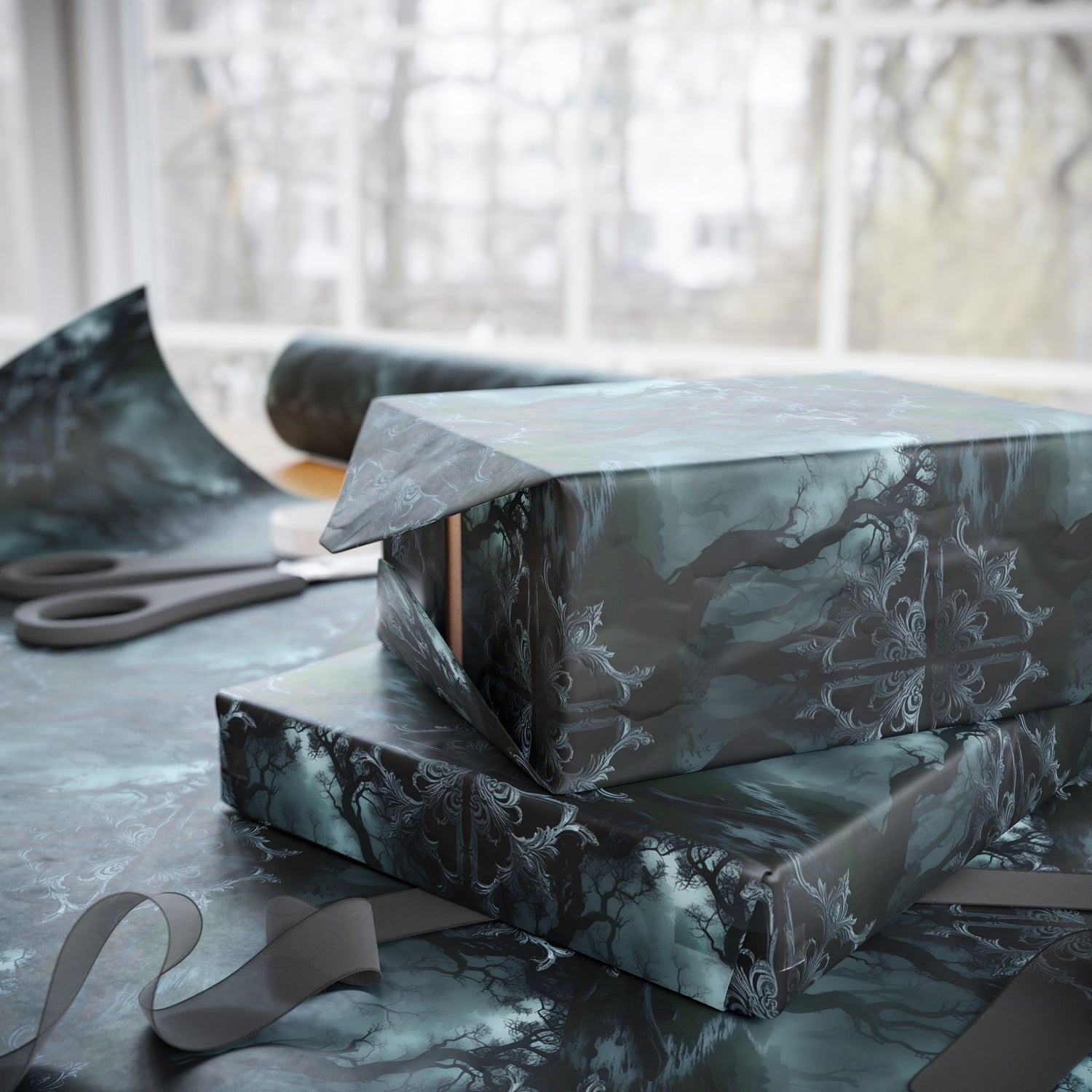Moonlite Forest | Gothic | Wrapping Papers, a beautifully haunting design, perfect for dark enchanted birthdays, anniversary and or weddings, adding a touch of mystery and elegance to your gift wrapping. Ideal for those who love gothic aesthetics and enjoy celebrating special occasions with a dark twist.