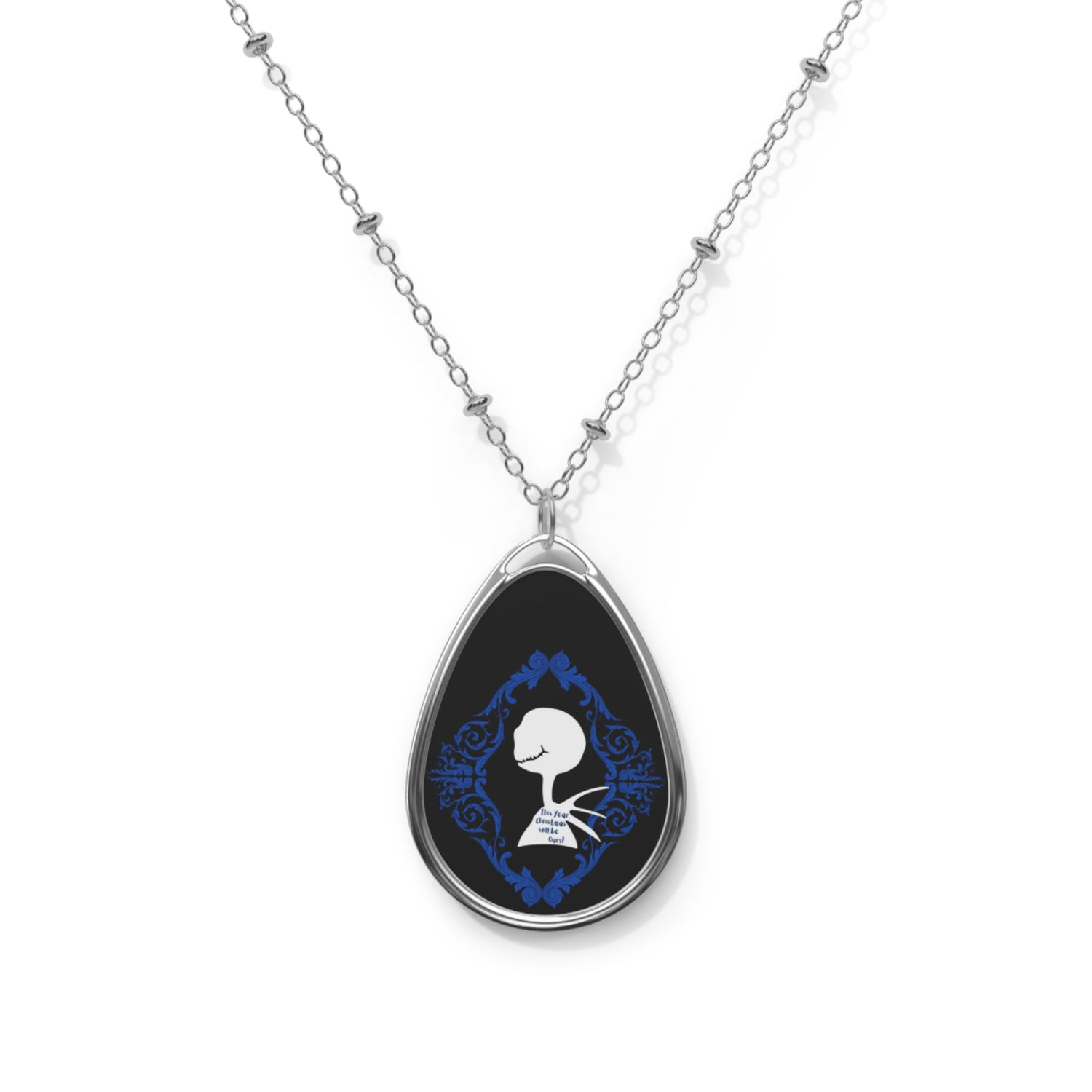 Gothic and Tim Burton inspired Oval Necklace featuring Skellington silhouette. This necklace is a great gift for fans of dark and quirky themes. Perfect for Halloween, Christmas, and any occasion where a touch of gothic charm is needed. Suitable for those who appreciate unique and unconventional jewelry.