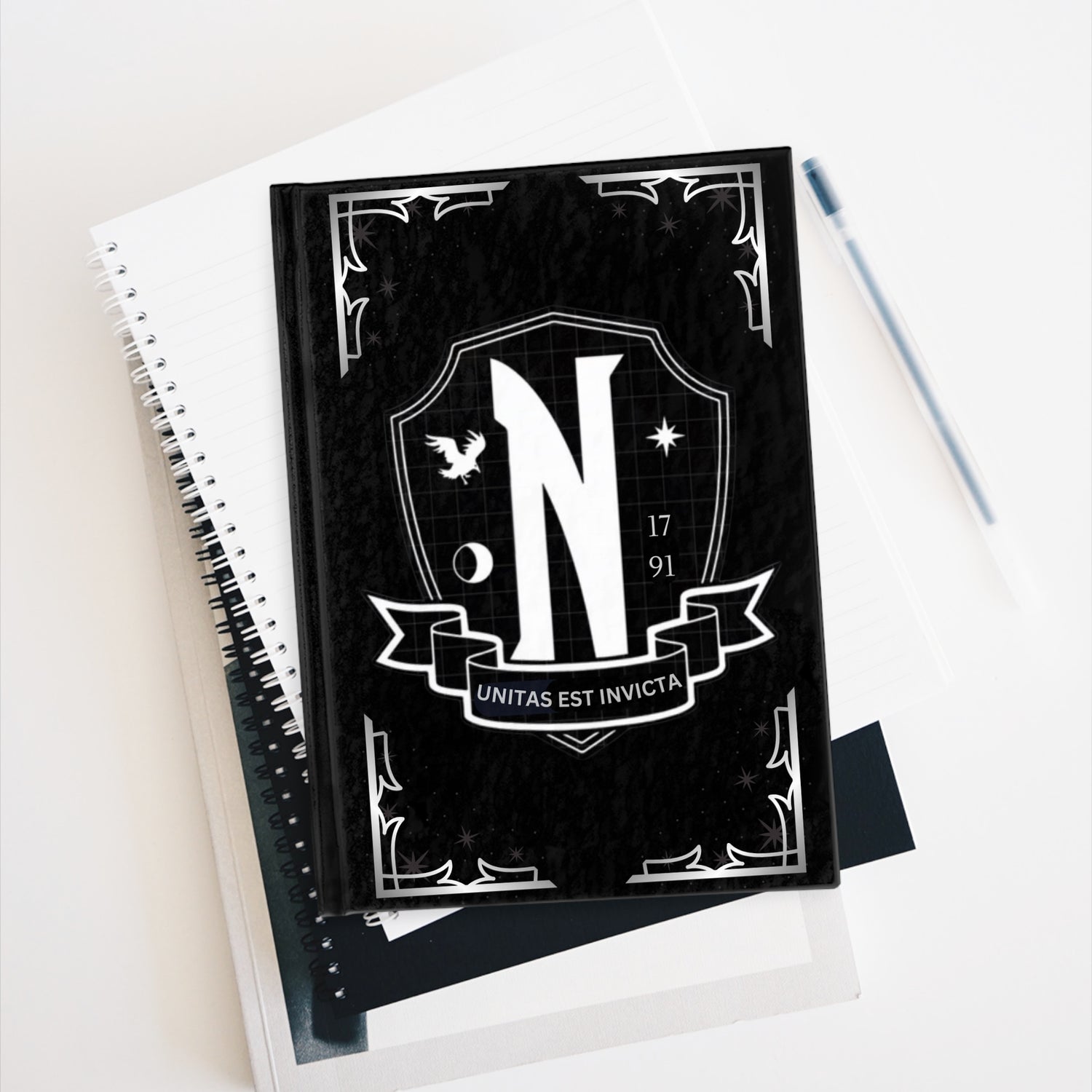 Standard non-color Nevermore Academy Notebook - Make your everyday notes/journaling more personal, private, and full of woe with this matte black hardcover journal. Featuring our beloved school crest on the front and haunting school Raven on the back.