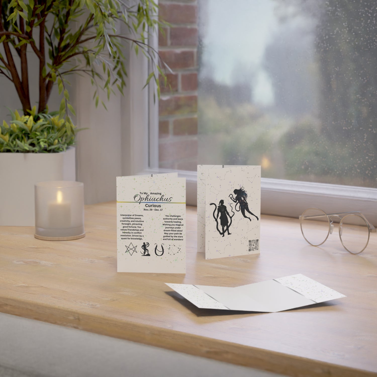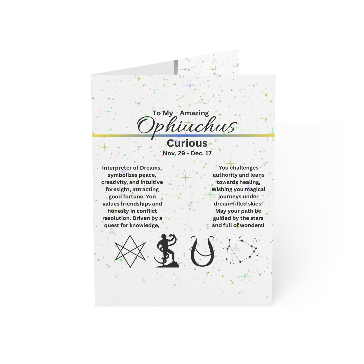 An Ophiuchus themed birthday card featuring vibrant colors and a premium quality finish. Perfect for astrology enthusiasts and those who appreciate unique designs. Ideal for birthdays, special occasions, and astrology-related celebrations.