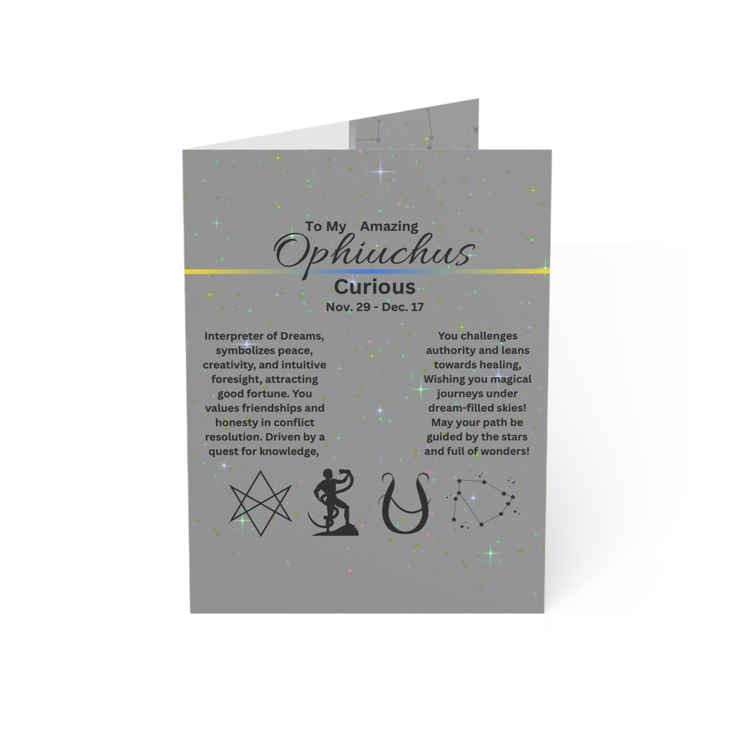 An Ophiuchus themed birthday card featuring vibrant colors and a premium quality finish. Perfect for astrology enthusiasts and those who appreciate unique designs. Ideal for birthdays, special occasions, and astrology-related celebrations.