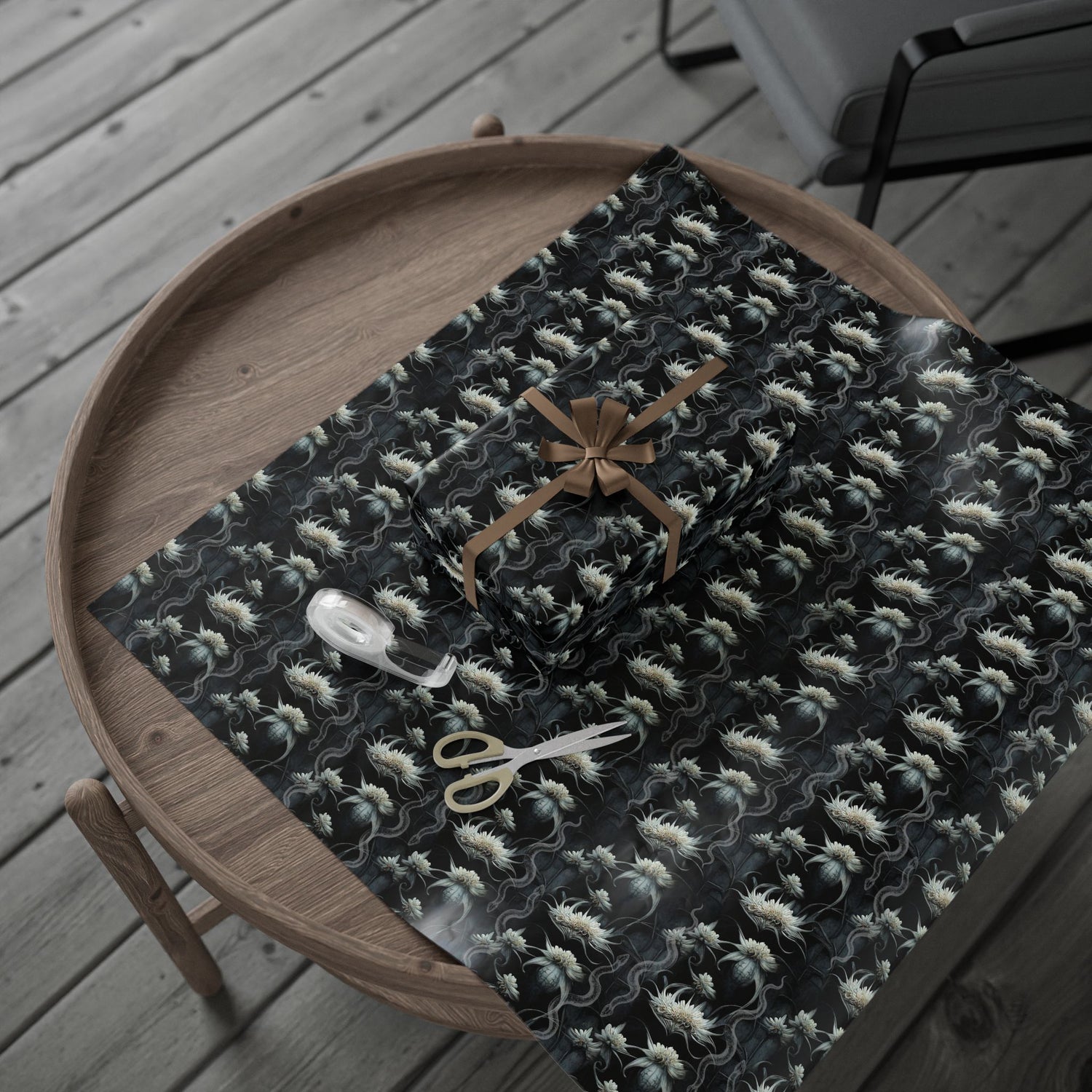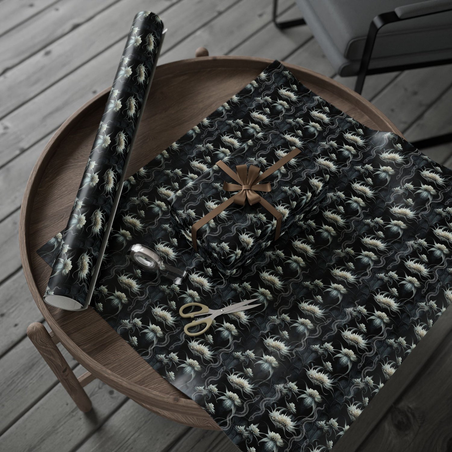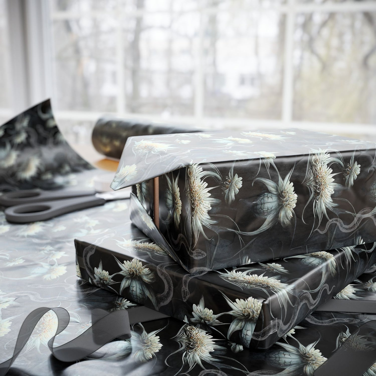 Snake Flowers | Night Garden | Gift Wrap Papers is a sheet of night-blooming mystery for the person who loves moody romance. Deep, inky backgrounds hold coiling snakes and delicate blooms—each wrap feels like a midnight garden laid over a present. Use it to dress wedding gifts with gothic elegance, to add drama to a birthday package, or to tuck around small tokens for someone who favors darker, artful aesthetics. The heavy, fine-art paper takes folds and ties cleanly, and the choice of glossy or matte lets you push the look toward luminous sheen or soft, velvety shadow. Small white margins and a discreet barcode sit at the edge, leaving the main illustration uninterrupted so the design reads like a painted scene when unwrapped.