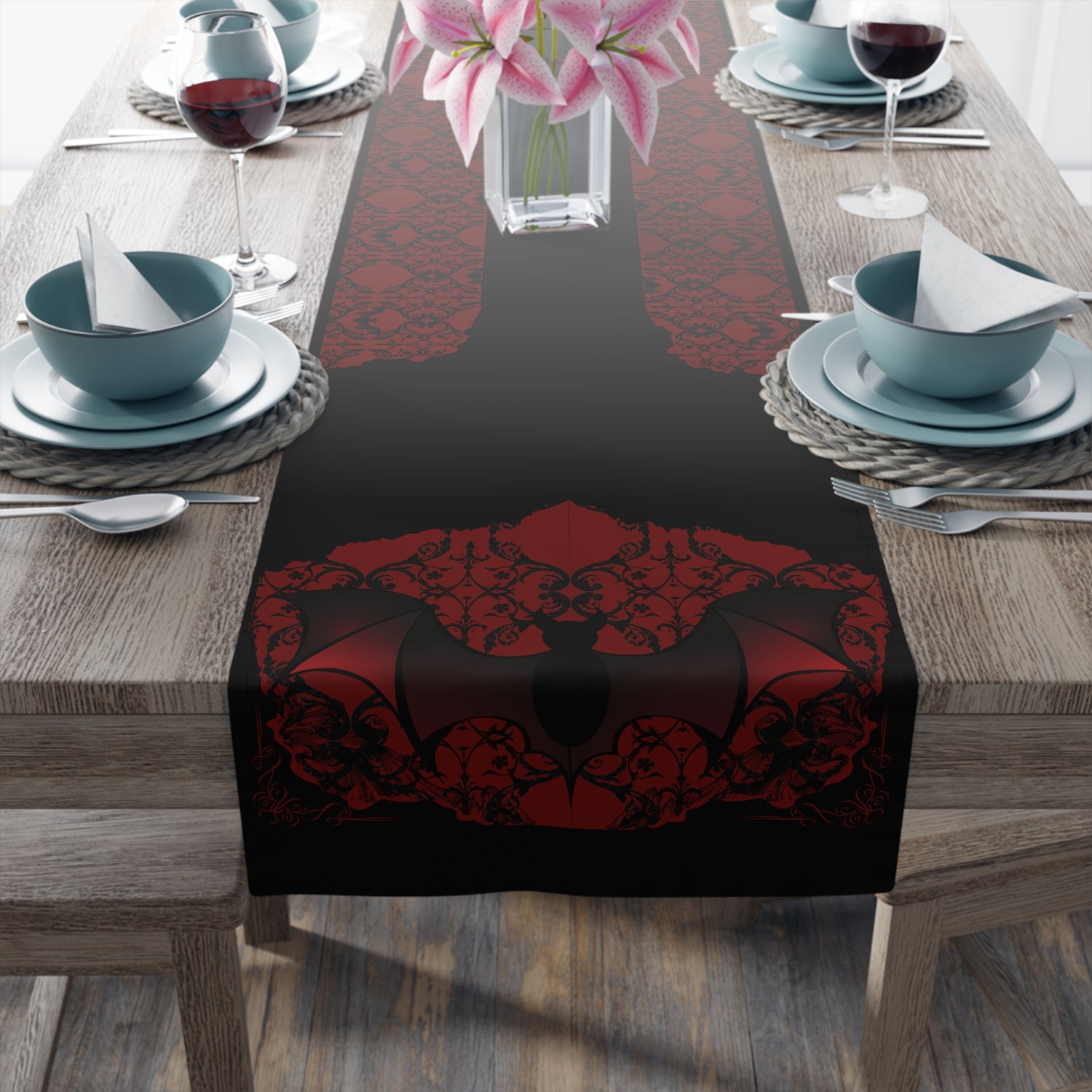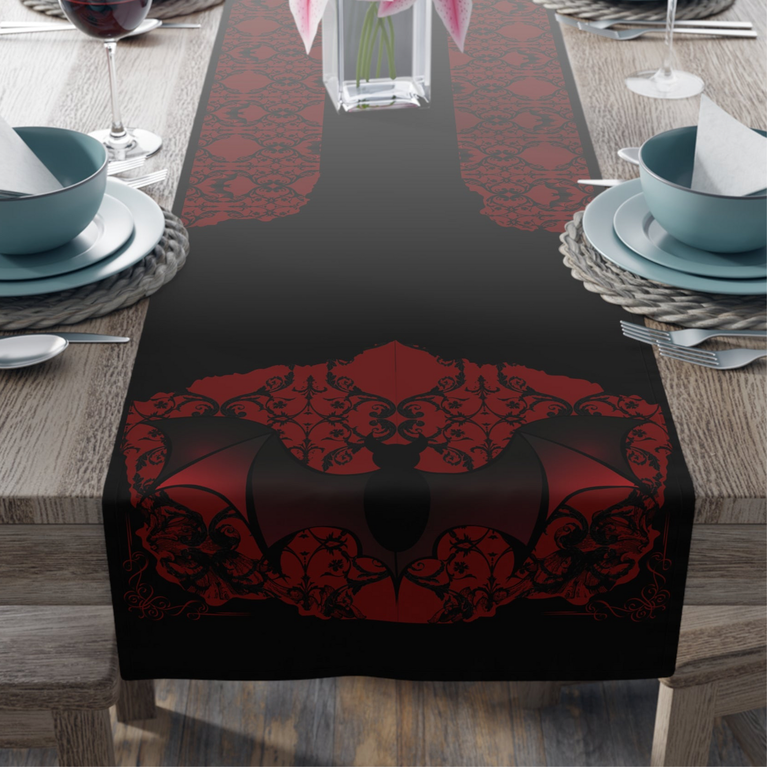 This Vampire Red Table Runner is perfect for those who love a Dark and Gothic aesthetic. With bat designs and a dark red color, it is ideal for creating a mysterious and elegant look, not just for the holidays but for many occasions. Perfect for those who celebrate Gothmas or love nightmare holiday decor.