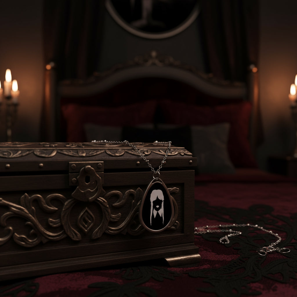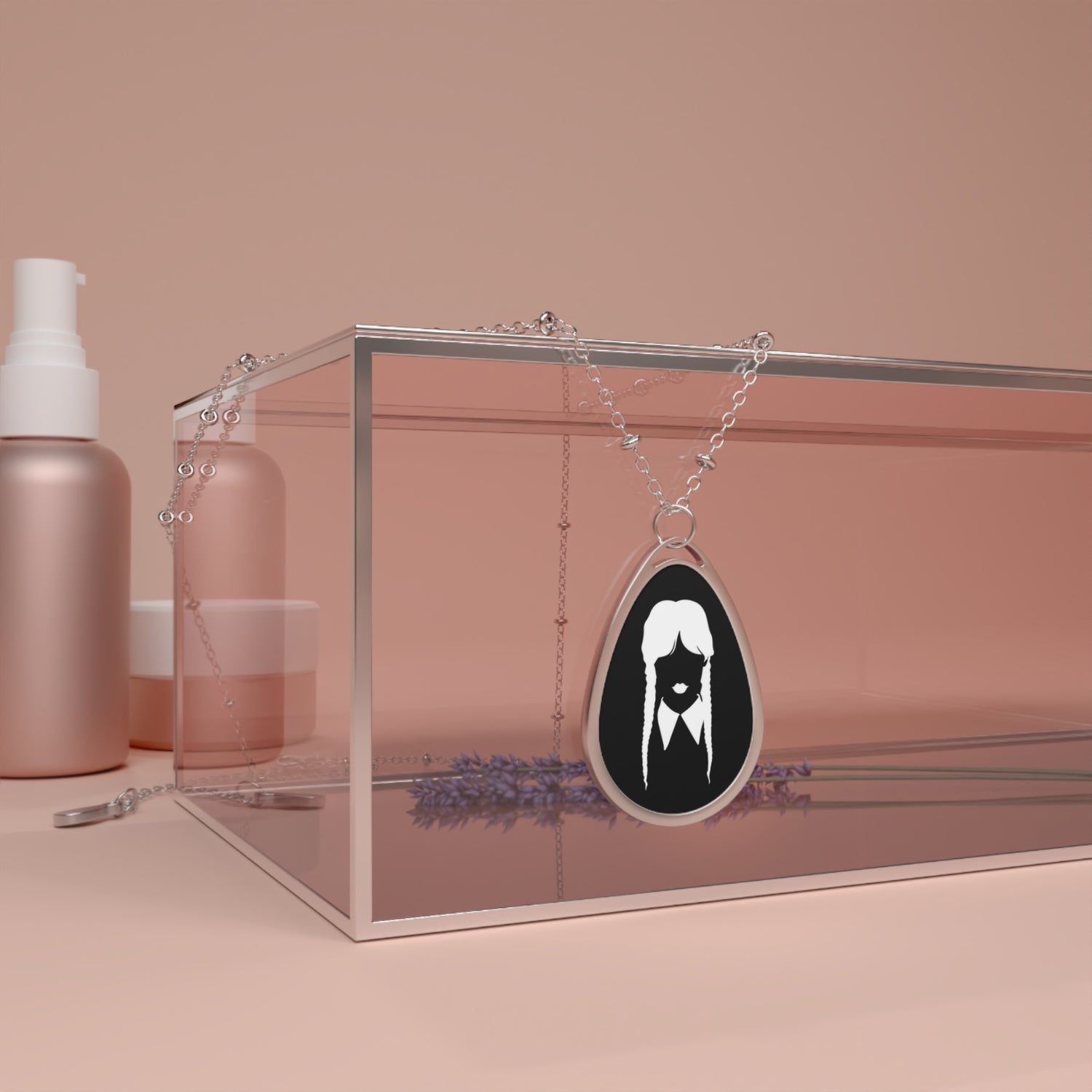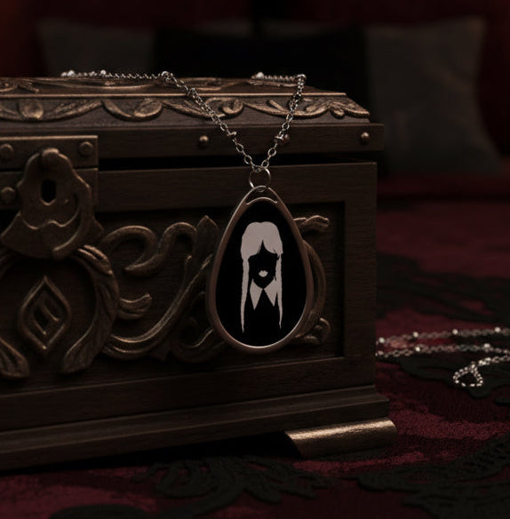 Gothic and Tim Burton inspired Oval Necklace featuring Wednesday silhouette. This necklace is a great gift for fans of dark and quirky themes. Perfect for Halloween, Christmas, and any occasion where a touch of gothic charm is needed. Suitable for those who appreciate unique and unconventional jewelry.